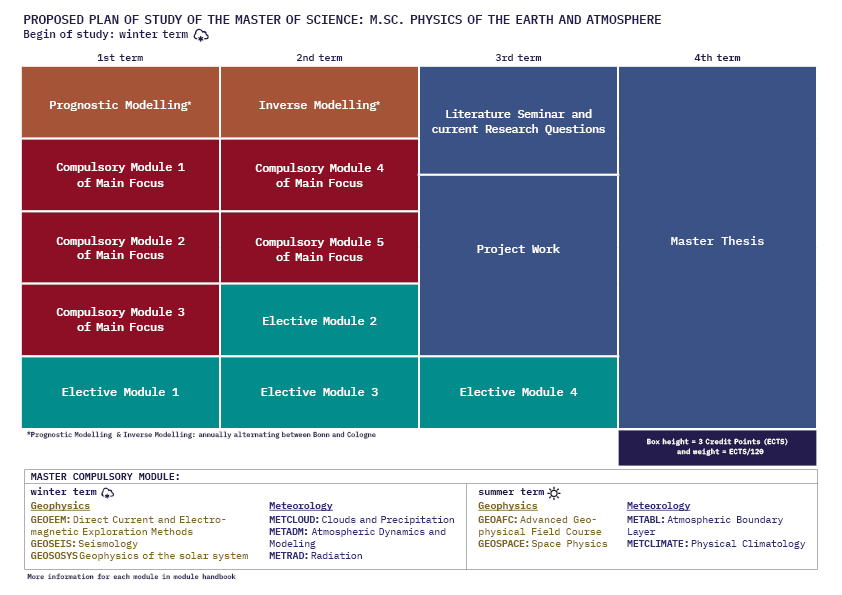 The elective modules may be chosen from a large set of modules from mathematics, physics, geophysics, meteorology and more, both from the university of Cologne and our partner university in Bonn.